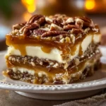 Serving Pecan Pie Lasagna creates a moment to savor and share. Consider placing it in your best dish to highlight its layers. When you take it out of the fridge, serve it chilled for the best taste. If you want to elevate the look, sprinkle some extra pecans or drizzle more caramel on top just before serving.